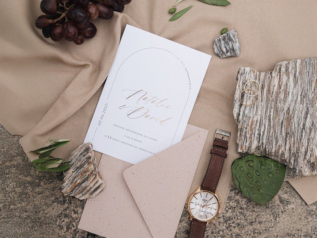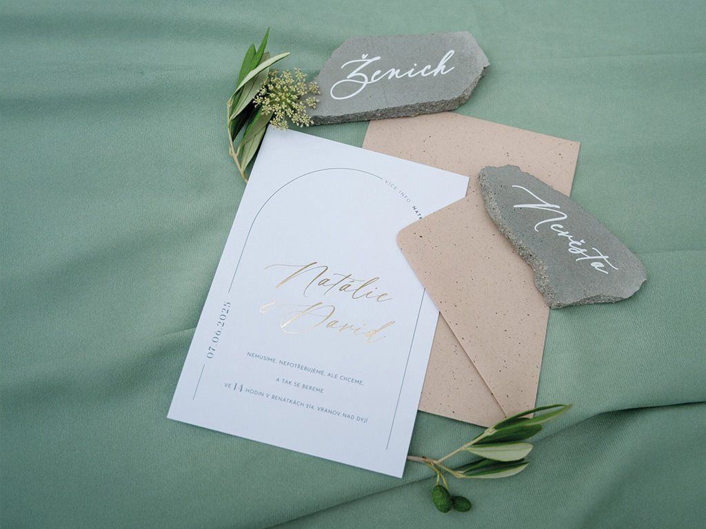 Minimalistické a čisté svatební oznámení na hladkém zářivě bílém papíře se zlatými nebo stříbrnými jmény.